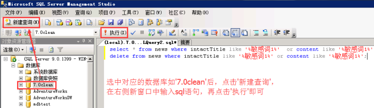 3.删除news表中标题或新闻内容中带有’待查询字符’的新闻,如下(对多个敏感词进行批量操作):
