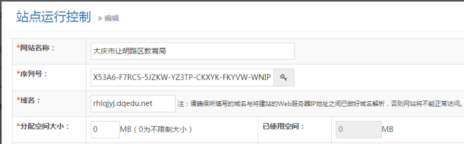 我们在这里修改子站序列号时,请检查一下域名、名称等子站基本信息是否与当前在使用的一致。在此修改提交的信息会自动同步更新子站的IIS、序列号会自动同步至该站点的Web.Config文件中,因此不推荐手动修改文件的方式更换序列号。